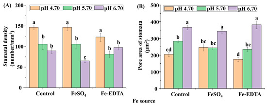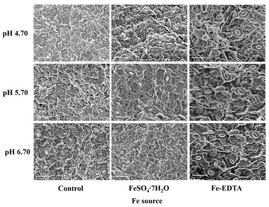 Leaf photosynthetic efficiency is dependent on the light capture ability, as well limited by gas exchange of leaves, and stomatal development is closely related to photosynthesis. The stomata were observed to have few trichomes, and many fine grooves and ridges on the exposed surface of the leaves (Figure 4). There were no differences in the structure of the stomata among the different treatments in this study. The stomatal density in the visual field of the control and treatments with supplementary FeSO4 and Fe-EDTA at pH 4.70 were higher than that found in the other treatments. The lowest was observed in the treatment with FeSO4 at pH 6.70 (Figure 5A). The stomatal area was greatest at pH 6.70, while the treatments at pH 4.70 have smallest stomatal area regardless of Fe source (Figure 5B).