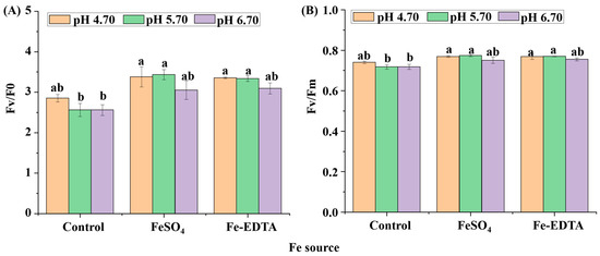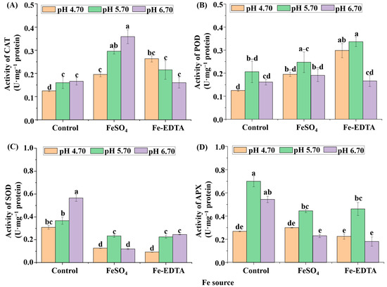 According to the results in Figure 8, the CAT activity of control and supplementary FeSO4 increased with the pH, and reached the maximum value in the treatment supplemental FeSO4 at pH 6.70. Oppositely, under supplemental Fe-EDTA, CAT activity was decreased with the increased of pH. The results of SOD activity showed that the control group was significantly higher than the treatments supplemental Fe. Moreover, both POD and APX activities were the greatest when the pH was 5.70 regardless of Fe source (Figure 8D).