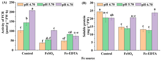 Protein is the structure of cells and the basis of life, including the activity of various enzymes. The soluble protein contents, and FCR activities were highly affected by the supplementary Fe source and pH (Figure 7). The FCR activities in the roots of the control group at pH 5.70 and 6.70 were significantly increased (Figure 7A), while the FCR activities decreased with supplementary FeSO4 and Fe-EDTA regardless of the pH. For the soluble protein content (Figure 7B), no significant differences were observed in the control group among the three pHs. The maximum soluble protein content was found with supplementary Fe-EDTA at pH 6.70, followed by supplementary FeSO4 at pH 6.70. There were no significant differences in the soluble protein content among treatments with supplementary FeSO4 and Fe-EDTA at pH 4.70 and 5.70.