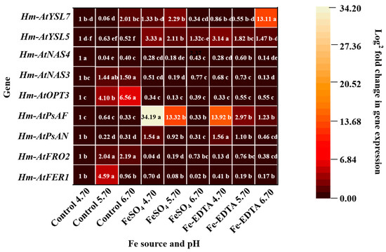 Expression profiles heat map of ferritin 1 (FER1), ferric reductase 2 (FRO2), photosystem I reaction center subunit N (PsAN), photosystem I subunit F (PsAF), oligopeptide transporters 3 (OPT3), nicotianamine synthase 3 (NAS3), NAS4, yellow stripe-like 5 (YSL5), and YSL7 in H. macrophylla after 60 days of culture. The gene expression is presented with a scale of fold change calculated by 2−ΔΔCT. Lowercase letters indicate significant differences calculated by Duncan’s multiple range test at p ≤ 0.05.