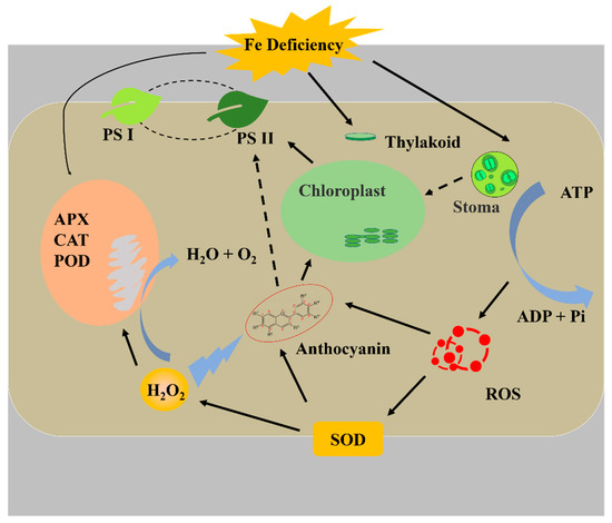 The relationships between the leaf color, and the contents of chlorophyll, anthocyanin, and carotenoid are noteworthy. Supplementary Fe increased the anthocyanin contents in leaves. Similarly, it was reported that Fe regulates the anthocyanin biosynthetic pathway and Fe supply increased the total anthocyanins content in Vitis vinifera [78]. However, it has not yet been elucidated if Fe has a direct or indirect effect on anthocyanins and their biosynthesis pathway. Although the accumulation of carotenoids and flavonoids mainly affects the flower color, they also influence the leaf color. Anthocyanin has a negative effect on photosynthesis, which could absorb more green light and accelerate the degradation of thylakoids, which causes a decrease in the photosynthetic rate [79]. Another suggestion is that anthocyanin acts as an antioxidant scavenging free radical and reduces the electron chain in photosynthesis [80]. The process is similar to the xanthophyll cycle. It has been reported that Fe deficient increased zeaxanthin to form light protection in pear (Pyrus communis) [74]. However, there is no evidence that anthocyanin was prominently photo-inhibitory or antioxidant in this study. It is can be determined that changes in the anthocyanins often indicate the variety of the antioxidant system. The SOD defends against oxidation and produces H2O2, then the H2O2 is scavenged by APX, CAT, and POD. It is reported that a higher SOD amount is found in purple leaves, which contain more anthocyanins, and H2O2 can induce the signal for anthocyanin biosynthesis [79,81]. In addition, APX, CAT, and POD act as the hemeproteins and their activities are affected both by the Fe content and ROS [82]. It has been reported that POD is more sensitive to H2O2 than CAT [83]; therefore, in this study, the activity of POD increased under pH 5.70, and similar results were observed with the activity of APX, it is speculated that the APX has a higher sensitivity to H2O2. In brief, as shown in Figure 10, Fe deficiency can directly reduce chlorophyll synthesis and affect plant growth. Furthermore, Fe deficiency increases the ROS content, which induces the antioxidant system, while insufficient antioxidant hemeproteins exacerbate the damage to plantlets.