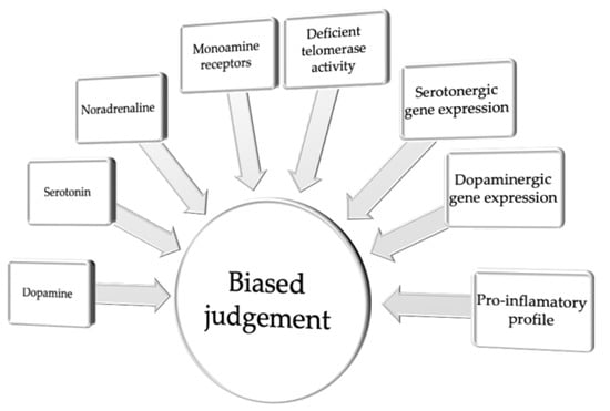 Taken together, although the mechanisms contributing to biased judgment in depression remain poorly understood, the majority of the studies conducted to date point to a common neuromolecular and cellular background of emotional regulation and cognitive judgment bias. This background includes various alterations in the function of the monoaminergic system function in the brain and associated physiological and cellular processes, such as a proinflammatory profile, variability in serotonergic and dopaminergic gene expression, or altered telomerase activity (Figure 1 and Table 1).