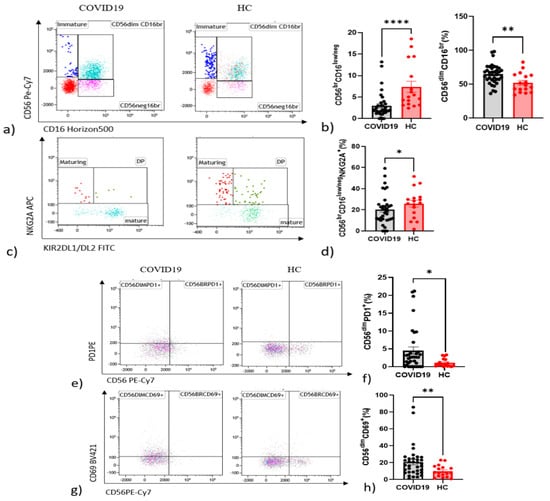 Regarding NK cell phenotype compared with healthy controls, patients with COVID-19 showed fewer immature CD56brightCD16neg NK cells (p < 0.0001) and maturing CD56dimCD16brightNKG2A+NK cells (p = 0.0437) (Figure 1a,b) and a parallel increase in the CD56dimCD16bright NK subset (p = 0.0057) (Figure 1c,d).