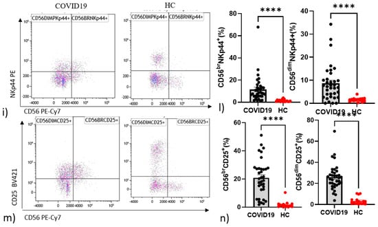 Interestingly, there were statistically significant increments in CD56dim NK cell activation marker CD69 C-type lectin (p = 0.038) (Figure 1e,f) and in CD56dim NK cells expressing the checkpoint molecule PD-1 (p = 0.040) in COVID-19 patients with respect to controls (Figure 1g,h). Higher percentages of CD25 in CD56bright (p < 0.0001) and CD56dim (p < 0.0001) were found in patients (Figure 1i,l). The same pattern emerged for NKp44 in CD56bright (p < 0.0001) and CD56dim (p < 0.0001) in patients (Figure 1m).