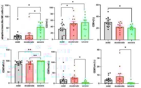 Regarding T cells, a key role was performed by CD8, CD8 T cells and their various subsets, including CD8Teff and CD8Tscm, were higher in controls and in patients with mild COVID-19 than in patients with moderate or severe disease. This interesting finding is in line with Uzhachenko et al. who demonstrated that cytotoxic NK and adaptive CD8+ T lymphocytes (CTL) interact to elicit specific cytolytic outcomes in viral infection [] and may therefore significantly influence the clinical course of COVID-19. Jiang reported that although CD8+ T and NK cells decreased in absolute number they increased in cytotoxic potential [].