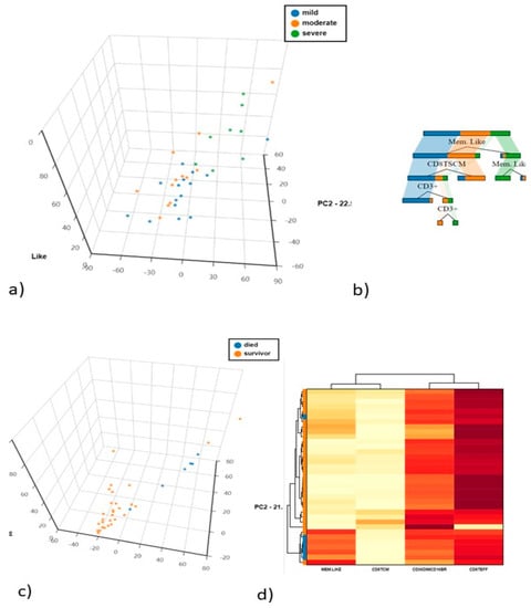 Six of the 35 patients enrolled in the study died. CD56dimCD16bright (p = 0.0301) and adaptive/memory-like NK cell frequencies were significantly higher in patients who died than in survivors (p = 0.0007). Regarding T cells, CD8TCM were less frequent (p = 0.048) and CD8Teff were more frequent (p = 0.0044) in patients who died than in survivors. Supervised PCA on these cell subsets showed that the first and second principal components explained 63% and 21.5% of the total variance, adaptive/memory-like NK cells being the most discriminatory variable, as confirmed by decision tree analysis to determine which variables clustered best according to the Gini criterion and by heatmap analysis (Figure 5c,d).