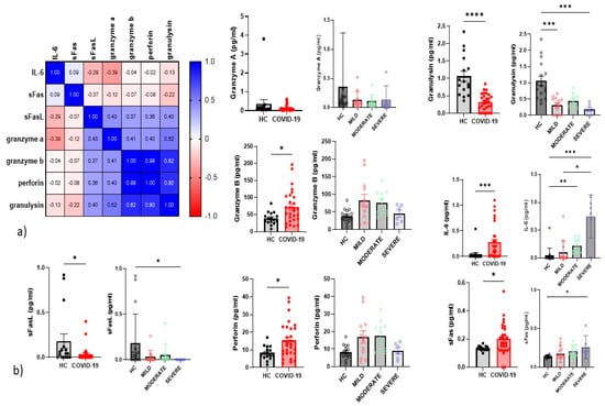 We examined inflammatory cytokines in the serum of all patients and controls enrolled in the study. The correlations between cytokines are reported in a correlation matrix (Figure 6a). where we observe a direct correlation between perforin and granzyme b (p < 0.0001 r = 0.97) and granulysin (p < 0.0001 r = 0.97). The only significant inverse correlation was between granzyme A and IL-6 (p = 0.037 r = -0.4). Severe COVID-19 patients showed higher serum concentrations of IL-6 than mild and control groups (Figure 6b). We found significantly higher serum concentrations of IL-6, sFas, granzyme B and perforin in patients than controls, and lower sFasL and granulysin (Figure 6a). Serum concentrations of sFas were higher in severe patients than controls. whereas those of sFasL and granulysin were lower in severe COVID-19 patients than controls.
