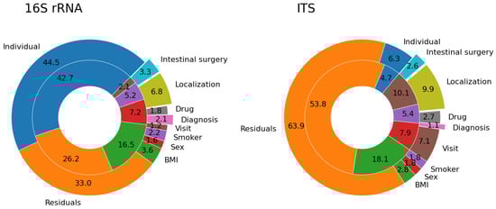 Proportion of beta diversity variance explained by our metadata categories. The pie charts show the percentages of variance in Bray-Curtis dissimilarity explained by different metadata categories in healthy controls (inner ring) and patients with IBD (outer ring). Data for both bacterial (16S rRNA) and fungal (ITS) microbiome are shown. Labels in the outer and inner rings share the same color code.