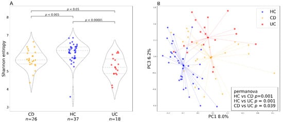 The bacterial diversity at baseline (week 0) differed between patients with CD and UC and healthy controls (Figure 2). Bacterial alpha diversity represented by Shannon entropy was highest in the HC group and lowest in the UC group (Figure 2A). Bacterial beta diversity represented by Bray–Curtis distance is illustrated by PCoA (Figure 2B). Statistically significant differences between the cluster centroids are supported by PERMANOVA and PERMDISP tests, but the contribution of diagnosis to the overall beta diversity variation is quite small.