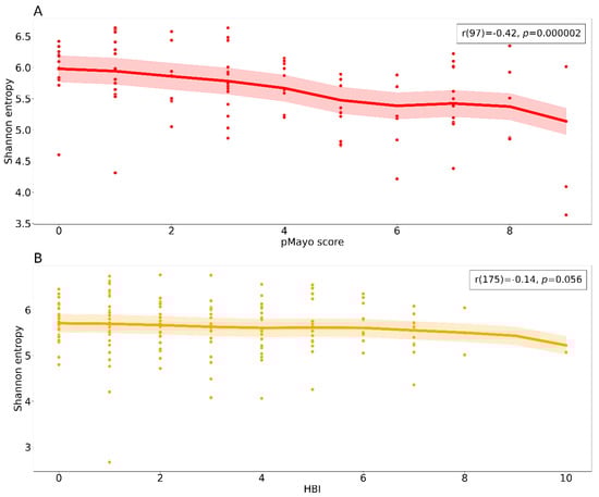 Relationship between alpha diversity and clinical scores. The scatter plots show a negative correlation between the clinical scores and Shannon entropy for both diagnostic groups (A) ulcerative colitis and (B) Crohn’s disease. Each dot represents a sample from a patient at a specific time point including the baseline. The bold lines represent locally weighted regression with a confidence interval fill. Spearman correlation results are reported in the upper right box. Abbreviations: pMayo, partial Mayo score; HBI, Harvey–Bradshaw index.