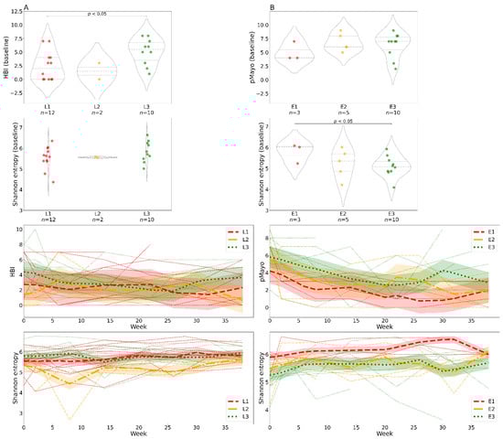 Differences in clinical scores and alpha diversity over time stratified by disease localization. In patients with Crohn’s disease (A) and ulcerative colitis (B). The violin plots show clinical scores and bacterial alpha diversity at baseline (week 0); the groups represent specific disease localizations. The line charts show changes in clinical scores and bacterial Shannon entropy over time and are color-coded by disease localization. Each line represents one individual; the bold lines represent locally weighted regression with a confidence interval fill. Abbreviations: HBI, Harvey–Bradshaw index; pMayo, partial Mayo score; L1, ileal Crohn’s disease; L2, colonic Crohn’s disease; L3, ileocolonic Crohn’s disease; E1, rectal ulcerative colitis; E2, ulcerative colitis distal to the splenic flexure; E3, ulcerative colitis affecting the whole large intestine and rectum; n, number of samples.