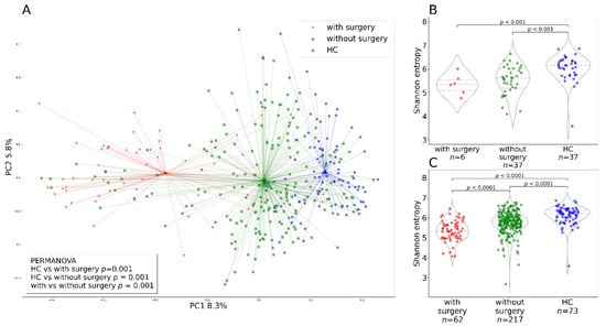 Alpha and beta diversity differences due to surgical procedure. (A) The PCoA plot shows beta diversity represented by the Bray–Curtis metric for patients with IBD with and without surgery, and healthy controls at various time points during the treatment including the baseline. Each dot represents a sample at a single time point and a line connects it to the cluster centroid. (B) Alpha diversity represented by Shannon entropy in Crohn’s disease patients at baseline categorized by intestinal surgery and in healthy controls. (C) Alpha diversity represented by Shannon entropy in the whole patients with IBD at various time points including baseline categorized by intestinal surgery and in healthy controls. Abbreviations: HC, healthy controls.