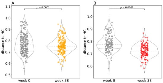 Distance to healthy controls at the beginning and at the end of therapy. A visual representation of the restricted permutation design with Bray–Curtis distance to healthy controls at the beginning (week 0) and at the end (week 38) of the study for Crohn’s disease (A) and ulcerative colitis (B) separately. In the violin plots, the middle dashed line represents the median and the outer dashed lines represent the first and third quartiles. Each dot in the superimposed strip plot represents a single distance from a patient at baseline (week 0) to a healthy control at baseline or a single distance from a patient at the endpoint (week 38) to a healthy control at the endpoint. Abbreviations: HC, healthy controls.