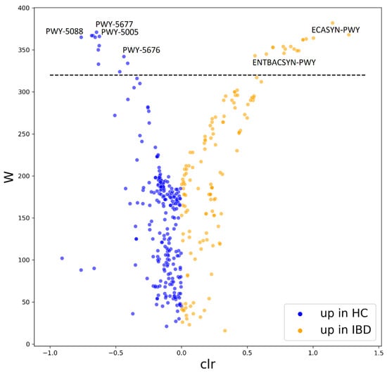Differentially abundant pathways reconstructed from 16S rRNA data by PICRUST2. The volcano plot shows the differentially abundant pathways between healthy controls and patients with IBD as determined by ANCOM. Each dot represents a pathway entry from the MetaCyc database, which was reconstructed from 16S rRNA data. Pathways increased in HC are blue, pathways increased in IBD are orange. The dashed line indicates the W-statistic cut-off value. The full list of the differentially abundant features can be found in Table S2. Abbreviations: HC, healthy controls; IBD, patients with inflammatory bowel disease; W, W-statistic; clr, centered log ratio; PWY-5677, succinate fermentation to butanoate; PWY-5005, biotin biosynthesis; PWY-5088, L-glutamate degradation to propionate; PWY-5676, acetyl-CoA fermentation to butanoate; ECASYN-PWY, enterobacterial common antigen biosynthesis; ENTBACSYN-PWY, enterobactin biosynthesis.