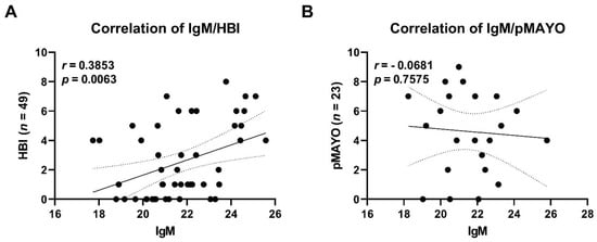 Correlation of total IgM serum levels and disease severity in patients with Crohn’s disease (A) and patients with ulcerative colitis (B). Each dot represents a sample from a patient at a specific time point. Trendline (bold line) including confidence interval (dotted line) is shown. Abbreviations: HBI, Harvey–Bradshaw index; pMayo, partial Mayo score; n, number of samples.