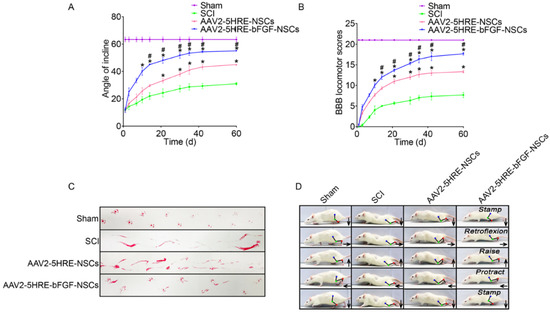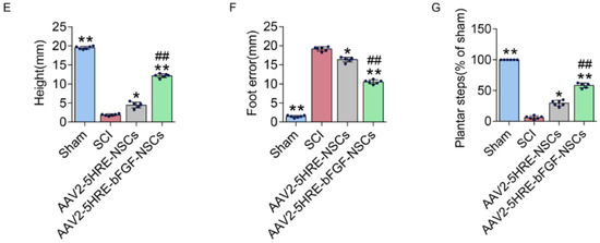 (A) The inclined plane test scores of sham, SCI group, adeno-associated virus 2-5HRE- neural stem cell (AAV2-5HRE-NSC) group, and AAV2-5HRE-basic FGF-NSC group. (B) The Basso–Beattie–Bresnahan (BBB) scales of sham, SCI group, AAV2-5HRE-NSC group, and AAV2-5HRE-bFGF-NSC group. Data are reported as the mean values ± SEM (n = 3). (C) Footprint examinations of the four studied groups. (D) Video sequences of a rat walking 2 months after SCI. Arrows indicate foot movement. Scale bar = 20 mm. (E) Height of the trunk from the ground reported as weight support, (F) foot error, and (G) plantar step. Data are reported as the mean values ± SEM (n = 6). # attributed to the p < 0.05, AAV2-5HRE-NSCs group verse SCI group, * is attributed to the p < 0.05, AAV2-5HRE-bFGF-NSCs verse AAV2-5HRE-NSCs group, ** is represented the p < 0.01, versus the SCI group or sham group, and finally ## is represented the p < 0.01, versus the AAV2-5HRE-NSCs group [45].