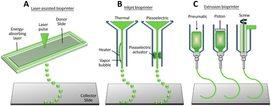 The most prevalent 3D bioprinting methods, which are used for tissue engineering applications. (A) Laser-assisted bioprinting, (B) Inkjet bioprinting, and (C) Microextrusion [64].