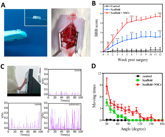 Functional recovery of SCI rats after three months of implantation. (A) Photographs of the scaffold with parallel linear arrays and implantation of the 3D bioprinted scaffold into the gap of the lesion area of SCI rats. (B) Basso-Beattie-Bresnahan (BBB) scores of rats in each group, ** p < 0.01, *** p < 0.001. (C) Image of SCI rats kicking the pressure sensor. Record of hindlimbs of SCI rats kicking the pressure sensor, and their relative voltages corresponding the hindlimb movement of SCI rats in the control, scaffold, and scaffold + NSCs groups. (D) Ankle angle distribution of SCI rats in the control, scaffold, and scaffold + NSCs groups). Reprinted from [66] with permission from Elsevier.