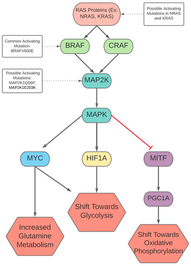 A common mechanism is that all forms of resistance to BRAF inhibitors result in the re-expression of MAPK, which in turn drives the glycolytic metabolic changes associated with the activation of the pathway [82]. Treatments have addressed these BRAF inhibitor resistances, such as using MAP2K1 inhibition against mutations that re-activate MAPK1/3 signaling. These treatments showed improvements in patient survival, despite adaptations that confer double resistance to this combined therapy [75,83]. Mechanisms of double resistance include the compensatory upregulation of MAPK7, a regulator of mitochondrial transcription [84]. While the initial response is enhanced by double blockade, resistance occurs as well and these resistance patterns are mediated in part by mitochondrial metabolism. For instance, BRAF inhibition results in the higher expression of PGC1A, allowing cells to maintain a bioenergetic threshold through oxidative phosphorylation [67].