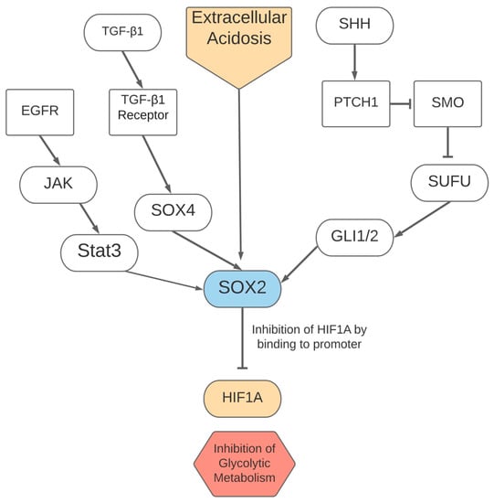 The expression of SRY-box transcription factor 2 (SOX2) is altered in multiple types of human malignancies, where increases in SOX2 via different pathways can result in metastasis, drug resistance, and the proliferation of cancer cells [103]. SOX2 has been observed to be amplified through a variety of pathways, including through EGFR-STAT3 signaling, TGF-β1 stimulation (mediated by SOX4), and sonic hedgehog (SHH) signaling via GLI1/GLI2 [104,105,106]. An acidic microenvironment, created by lactate as a byproduct of glycolysis and fermentation, also induces SOX2 expression as shown in Figure 2. Subsequently, SOX2 expression induces a shift towards oxidative phosphorylation, potentially to reduce glycolytic activity and prevent excessive acidity [20]. Tumors in an acidic microenvironment are significant, as they have been observed to have an aggressive phenotype. This has been associated with a relatively high use of oxidative phosphorylation and potential for cell motility, so SOX2 as a mechanism for this induction of oxidative phosphorylation would be of therapeutic interest [19,20].