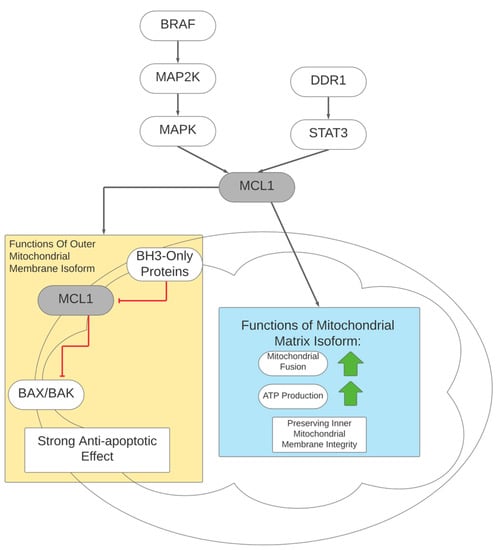 The expression of MCL1 is induced through multiple pathways. MAPK1/3 signaling promotes the transcription of MCL1 along with BCL2 and BCL2L1, proteins in the same family that are responsible for the regulation of apoptosis [114]. In melanoma, the relatively high proportion of MCL1 to BCL2L1 highlights its predominant role in preventing apoptosis [115,116]. Furthermore, MAPK1/3 activation also helps retain MCL1 expression by slowing the degradation of the protein via the phosphorylation of threonine 163 [117]. Oncogenic BRAF overexpression, upstream of MAPK1/3, is also associated with higher MCL1 expression [118]. Discordin domain receptor tyrosine kinase 1 (DDR1) has also been implicated in MCL1 expression in uveal melanoma, where the downregulation of DDR1 also decreases MCL1 expression [119]. This pathway is likely mediated by STAT3, as the knockdown of DDR1 led to less STAT3 binding to the promoter region for the MCL1 gene. The inhibition of DDR1 with 7rh, a potential drug compound, to induce apoptosis was resisted by the forced overexpression of MCL1, providing evidence that MCL1 is the component actively resisting apoptosis in DDR1-mediated cell survival [119]. The regulation of MCL1 and the roles of the matrix versus outer mitochondrial membrane isoforms are illustrated in Figure 3.