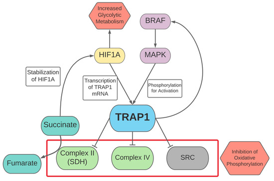 TRAP1 has also been observed to play a role in the regulation of BRAF, subsequently activating the MAPK signaling pathway and inducing the associated metabolic effects described in the BRAF section above [125]. A study on colorectal tumors found a positive correlation between TRAP1 and BRAF levels [42]. Furthermore, the study found that TRAP1/HSP90 inhibitors led to a decrease in BRAF, with this effect appearing more pronounced in colorectal tumor cell lines with the BRAFV600E mutation, suggesting that TRAP1 plays a key role in maintaining BRAF expression [42]. Given the role of BRAF signaling in activating genes associated with glycolysis, this strengthens the role of TRAP1 in modulating a shift towards a more glycolytic metabolism as shown in Figure 4.
