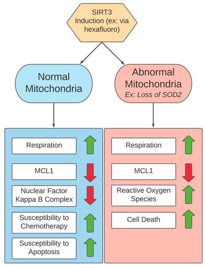 The analysis of the two cell lines demonstrated that the resistant cell line had lost expression of SOD2, which is associated with a highly aggressive phenotype in melanoma [154]. Interestingly, the SIRT3-driven detoxification of ROS is partially mediated through the activation of SOD2, so this aggressive phenotype with defective detoxification of reactive oxygen could be vulnerable to cytotoxic oxygen in the more oxidative metabolism induced by SIRT3 [32]. The induction of SIRT3 causes the overall amplification of mitochondria, and the amplification of mitochondria that are defective in SOD2 could result in a cytotoxic increase in reactive oxygen [146,154]. Through SIRT3, honokiol derivatives might have driven mitochondrial fusion, a morphology favoring oxidative phosphorylation [154]. Tumors which have high levels of SIRT3 in vivo may have normal or nearly normal mitochondria due to the important regulatory role of SIRT3, while tumors which have lower levels of SIRT3 may have mitochondrial abnormalities and may be susceptible to SIRT3 activation [153]. Furthermore, inducing SIRT3 could reduce MCL1, decreasing resistance to apoptosis, while shifting away from a glycolytic metabolism could decrease chemoresistance mediated by the nuclear factor kappa B complex [18,155]. Effects of SIRT3 induction and the differences in response between normal and abnormal mitochondria are summarized in Figure 6. As melanoma cells can preferentially use a combination of glycolysis and oxidative phosphorylation, examining when to suppress (countering respiration-dependent growth) or induce (targeting weaknesses in ROS detoxification in treatment-resistant melanomas) SIRT3 could be helpful.