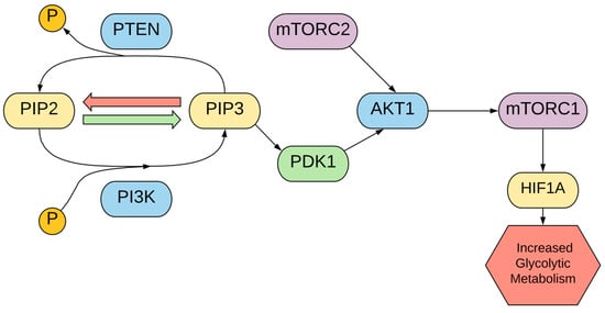 Mechanistically, phosphoinositide 3-kinase (PI3K) phosphorylates PIP2, resulting in PIP3, which can be dephosphorylated by PTEN activity. PIP3 recruits AKT1 and PDK1, facilitating the phosphorylation of the threonine 308 residue on AKT1 [162]. AKT1 is also phosphorylated by the mTORC2 protein complex on its serine 473 residue, with these two phosphorylation events activating AKT1 activity [162,163]. AKT1 then activates the protein complex mTORC1, which regulates protein synthesis, cell growth, and cellular proliferation [164]. As cell growth through protein synthesis is important for tumor growth, the PI3K/AKT1/mTORC1 pathway, summarized in Figure 7, is often upregulated in cancers including melanoma [55]. For instance, in other skin cancers such as basal and squamous cell carcinoma, the upregulation of the AKT1 signaling pathway has been implicated in tumorigenesis and hyperproliferation [165]. In addition to protein synthesis, mTORC1 has been proposed as a regulator of HIF1A, contributing to aerobic glycolysis [163,166]. Subsequently, the upregulation of the PI3K/AKT1/mTORC1 axis has been implicated in the upregulation of glycolytic enzymes [5]. Mutations in PTEN, as mentioned above, and the mutation of the PIK3CA gene which leads to the hyperactivity of PI3K contribute to this overactivation.