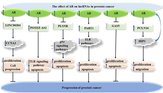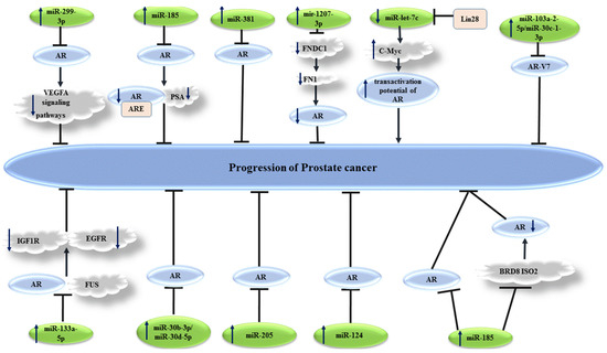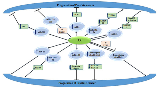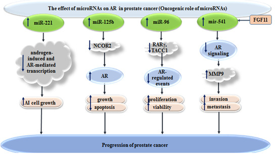 Several miRNAs have been shown to affect levels of androgen receptor (AR), thus influencing the progression of prostate cancer. Detailed information about these miRNAs is presented in Table 1. (