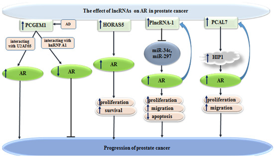 Several other oncogenic lncRNAs have been found to regulate AR signaling. For instance, HOTAIR increases AR-mediated transcriptional program and induces CRPC phenotypes [71]. Moreover, MALAT1 has been shown to suppress cell cycle progression in this type of cancer through regulation of AR signaling [72]. LINC00844 is another lncRNA that affects migration and invasion of prostate cancer cells through modulation of this route [73].