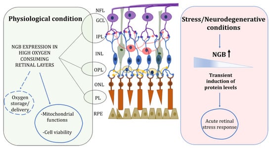 Consequently, since the inducible nature of NGB and the proposed function in the rapid stress response aimed to preserve retinal tissue [,], NGB levels and intracellular/extracellular distribution could differentially reflect the retinal status and the stressing condition (Figure 1). Therefore, the exact correlation between NGB and retinal status is worth to be further deepened for defining NGB functionality in the retina and its possible role as a general biomarker of retinal disease.