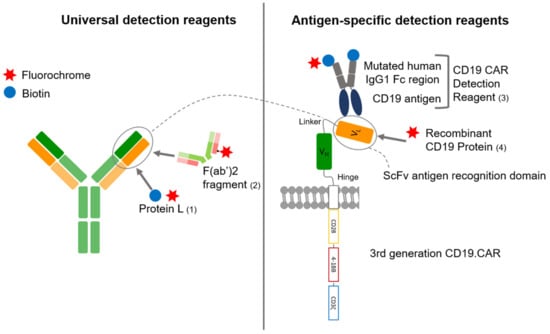 Universal CAR detection reagents, such as anti-Fab antibodies and Protein L, are non-antigen specific and can therefore be used for CARs of different design and antigen-specificity. Both target IgG-like fragments. While they are more cost effective, they might on the other hand be characterized by a higher background staining [19].