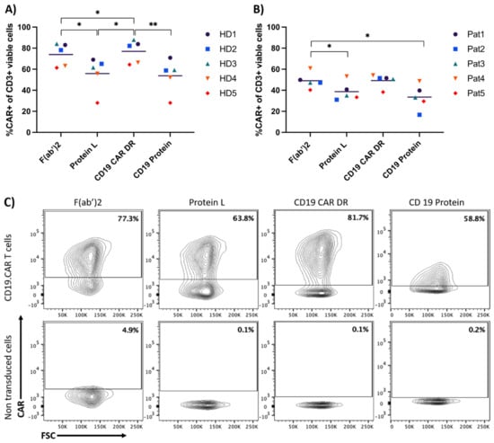Comparison of four different antibodies to detect CD19-specific CAR-T cells. Both graphs show the different percentages for CAR-T cell detection when using the displayed staining reagents. (A) depicts the percentage of CAR-T cells produced from five different HD samples. (B) shows the percentage of CAR-T cells produced from five different patient samples (Pat). (C) shows the contour plots for CAR-T cells of one HD stained with all four different antibodies. The gate for the non-transduced cells is the same as in the respective CD19.CAR-T cell group. Comparison for HDs and patient samples were evaluated in three independent experiments respectively. (*) p < 0.05; (**) p < 0.01 by one-way ANOVA.
