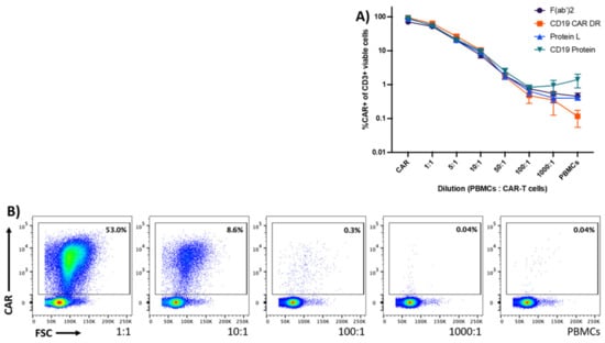 Sensitivity of the detection reagents to detect CD19-specific CAR-T cells in PBMCs. Graph (A) shows CD19-specific CAR-T cells that were serially diluted in PBMCs of the same HD at six different dilutions (1:1 to 1:1000). The graph displays the mean values ± standard error of mean of CAR-T cells to PBMCs from four HDs. (B) The dot plots display representative data obtained from one out of four different HDs. Data are representative of four different HDs acquired in one experiment.