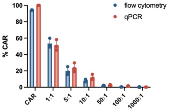 qPCR enables CAR detection on a genomic level and flow cytometry CAR expression on the cell surface. We compared the flow cytometry-based CAR-T quantification with a previously published qPCR-based method [16]. To that end, we generated CAR-T cells from three different HDs and performed a serial dilution (1:0, 1:1, 1:5, 1:10, 1:50, 1:100, 1:1000). The serial dilution was adjusted to the amount of CAR-transduced cells measured by the transduction efficiency.