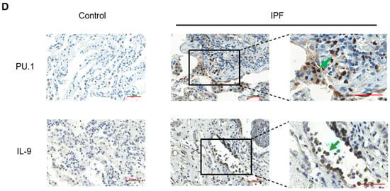 To clarify whether the distribution and differentiation of Th9 cells are altered in the lungs of patients with IPF, we examined PU.1 (the specific transcription factor of Th9 cells) in the lung tissues of patients with IPF (n = 14) and controls (n = 4) by immunohistochemistry (Table 2). As expected, the expression of PU.1 in the lungs of patients with IPF was significantly increased as compared to the controls (Figure 1D), indicating an increased differentiation of Th9 cells in the lungs of patients with IPF. As the main cytokine secreted by Th9 cells is IL-9, we then examined the expression and distribution of IL-9 in the lung tissue of patients with IPF (n = 14) and controls (n = 4) by immunohistochemistry. The results showed an increased IL-9 expression in the lungs of patients with IPF as well (Figure 1D).