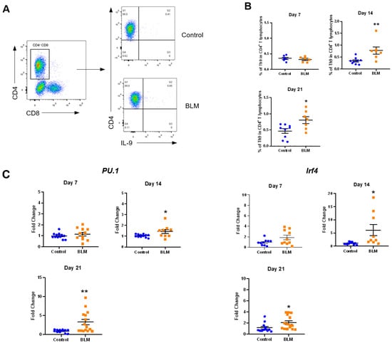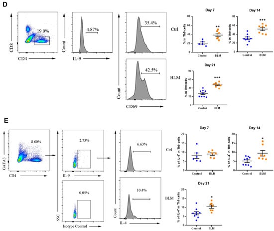 We then harvested the lungs of BLM mice on day 7, 14, and 21 after BLM treatment and analyzed the content and activation of Th9 cells by flow cytometry (Figure 2A). We found that starting from day 14 after BLM treatment, the proportion of Th9 cells in CD4+ T lymphocytes in the lungs of the model group was significantly higher than that in the control group (control group: 0.3413 ± 0.04497%, model group: 0.7787 ± 0.1534%, p < 0.01) and this trend persisted until day 21 after BLM treatment (day 21: control group: 0.4669 ± 0.0714%, model group: 0.8054 ± 0.1093%, p < 0.05) (Figure 2B). These results demonstrated that the number of Th9 cells in the lung tissue of BLM mice increased. We also examined the expression level of PU.1 and Irf4, two transcription factors important for Th9 differentiation, in BALF cells of BLM mice and control mice. We found that, starting from day 14 after treatment, the expression levels of PU.1 and Irf4 in the BLM-treated group were significantly higher than those in the control group (PU.1: day 14, p < 0.05; day 21, p < 0.01; Irf4: day 14, p < 0.05; day 21, p < 0.05) (Figure 2C). Consistent with this, the flow cytometry results also suggested that Th9 cell activation in the lungs of BLM mice was significantly higher than that in the control group (day 7, p < 0.01; day 14, p < 0.001; day 21, p < 0.0001) (Figure 2D), indicating an increased number and function of Th9 cells in the lungs of BLM mice. In addition, previous studies have shown that various CD4+ T cell subsets are not stable and mutual transformation is observed among these subsets [31]. Th9 cell subset can also transform into other Th cell subsets in a polarized microenvironment [32]. Therefore, we tested whether Th9 cells in the lungs of BLM mice functioned as other subsets, especially Th2 subset. In addition to IL-9, we found that Th9 cells in the model group had a higher proportion of CD4+IL9+IL-4+ T cell subset, suggesting an increased IL-4 secretion by Th9 cells in the lungs of BLM mice (day 14: control group: 5.106 ± 0.7764%, model group: 9.391 ± 1.528%, p < 0.05; day 21: control group: 6.700 ± 0.9240%, model group: 10.33 ± 0.9359%, p < 0.05) (Figure 2E).