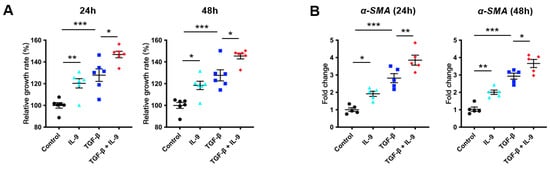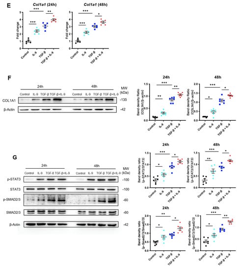 Previous studies have shown that IL-9 promotes cell proliferation [33,34]. Lung fibroblasts, the major effector cells of the progressive fibrotic process in IPF, secrete excess extracellular matrix, and eventually lead to pulmonary fibrosis. In order to test the effect of IL-9 on the proliferation of fibroblasts, we isolated lung fibroblasts from wild-type mice and stimulated them with IL-9 alone or in the presence of TGF-β (TGF-β was used to mimic the lung microenvironment in pulmonary fibrosis) for 24 or 48 h, and the cell proliferation rate was determined by CCK8 assay. The results showed that 24 h after IL-9 stimulation, the cell proliferation rate was significantly increased as compared to the control group, either in the absence (p = 0.0108) or presence (p = 0.0144) of TGF-β. 48 h after stimulation, the change trend of each group was consistent with that of 24 h (Figure 3A). These data demonstrated that IL-9 alone or together with TGF-β can promote the proliferation of mouse primary lung fibroblasts in vitro. During the development of pulmonary fibrosis, fibroblasts differentiate into myofibroblasts and secrete more collagen. To clarify whether IL-9 activates fibroblasts, we stimulated fibroblasts with IL-9 alone or in the presence of TGF-β. Real-time quantitative PCR was used to detect the expression of α-SMA, which is a marker of fibroblast activation. 24 h after stimulation, IL-9, either alone or together with TGF-β, increased the expression level of α-SMA as compared to the control group (p < 0.001, p = 0.0252). 48 h of stimulation showed the same change trend of each group as that of 24 h (Figure 3B). These results indicated that IL-9, either in the absence or presence of TGF-β, can increase activation of mouse primary lung fibroblasts in vitro. In addition to real-time qPCR, we also detected an enhanced expression level of α-SMA by immunofluorescence (Figure 3C). In order to verify the results at the protein level, we detected the α-SMA expression by Western blot and found that it was markedly increased after IL-9 stimulation than that in the control (Figure 3D), corroborated the immunofluorescence results. During the progress of IPF, (myo)fibroblasts secrete a large amount of extracellular matrix, including collagen I. In order to determine the effect of IL-9 on collagen I secretion by fibroblasts, we stimulated fibroblasts with IL-9 alone or in the presence of TGF-β for 24 h or 48 h and then detected the Col1a1 expression by real-time qPCR. The results showed that 24 h after stimulation, Col1a1 expression in IL-9 group was remarkably higher than that in the control group (p < 0.001). The mRNA expression of Col1a1 in the IL-9 and TGF-β-stimulated group was also significantly higher than that in the TGF-β-stimulated group (p = 0.0091). 48 h after stimulation, the change trend of each group was consistent with that of 24 h (Figure 3E). We obtained similar results by Western blot (Figure 3F). These data demonstrated that IL-9 alone or together with TGF-β can promote the Col1a1 secretion of mouse primary lung fibroblasts in vitro. Previous studies have shown that an increased STAT3 and SMAD2/3 phosphorylation participates in IPF progression [35,36]. We therefore wondered if they are involved in the effect of IL-9 on fibroblasts. The results showed that stimulation of fibroblasts with IL-9 alone or together with TGF-β for 24 h increased the phosphorylation of STAT3 (p = 0.043, p = 0.0341) and SMAD2/3 (p = 0.0366, p = 0.0126), and stimulation for 48 h showed a similar pattern (Figure 3G). Taken together, these results indicated that IL-9 can promote proliferation, activation, and collagen secretion of fibroblasts. Moreover, an increased phosphorylation of STAT3 and SMAD2/3 may be involved in the effect of IL-9 on fibroblasts.
