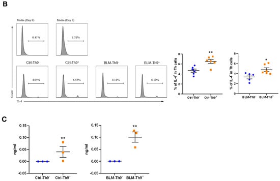 We analyzed the percentages of various lung lymphocyte subsets of BLM mice by flow cytometry and found that the proportion of CD4+IL9+IL-4+ T cell subset was increased in the lung tissue of BLM mice, suggesting an increased IL-4 secretion by Th9 cells in the lungs of BLM mice. However, whether Th9 cells secrete IL-4 is controversial. By inducing Th0 cells to differentiate into Th9 cells with IL-4 and TGF-β in vitro, Schmitt and Veldhoen did not detect IL-4 content in the cell culture supernatant by ELISA [44,45]. In contrast, Saeki’s study showed that Th9 cells have the ability to secrete IL-4 [29]. IL-4 can stimulate Th0 cells to differentiate into Th2 cells [46]. We then hypothesized that Th9 cells may promote the differentiation of Th0 cells to Th2 cells by secreting IL-4, thereby accelerating the Th1/Th2 imbalance and forming a positive feedback to promote fibrosis process. Therefore, we co-cultured in vitro differentiated Th9 cells with Th0 cells and found that Th9 cells indeed promoted the differentiation of Th0 cells to Th2 cells. In addition, IL-4 can also promote fibroblast proliferation and activation [10,47]. We then examined the effects of Th9 cells on fibroblasts in vitro and found that Th9 cells promoted collagen secretion. This may be due to the combined effect of IL-4 and IL-9 secreted by Th9 cells (we have already shown that IL-9 promotes fibroblast activation and collagen secretion). Collectively, these results indicate that Th9 cells promote fibrosis in vitro.