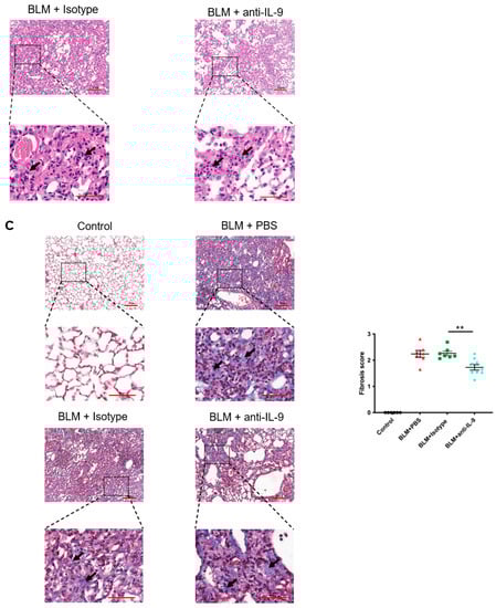 The above experiments demonstrated that Th9 cells and IL-9 promote pulmonary fibrosis. Next, we verified whether neutralizing IL-9 could reduce pulmonary fibrosis of BLM mice. The BLM model undergoes an inflammatory phase (0–7 d) and a fibrosis phase (after 7 d). Animal drug administration during these two phases is regarded as preventive and therapeutic, respectively [37]. From the first day after BLM instillation, we intraperitoneally injected BLM mice with IL-9 neutralizing antibody every 3 days (Figure 5A). HE staining showed that, 21 days after BLM treatment, the lung tissue of BLM group (BLM + PBS) and IgG isotype control group (BLM + Isotype) had severe damage and inflammatory cell infiltration (indicated by the black arrow). BLM + Isotype group was defined as the control group. The inflammatory response in the lungs of IL-9 neutralizing antibody group was significantly decreased (Figure 5B). The degree of pulmonary fibrosis was evaluated with Ashcroft score (the more severe the degree of fibrosis, the higher the Ashcroft score) and we found that neutralizing IL-9 had remarkable lower Ashcroft scores than control group (p = 0.0024) (Figure 5B). Distribution of collagen fibers in the lung tissue and degree of fibrosis were also evaluated by Masson staining (the more severe the degree of fibrosis, the higher the fibrosis score). It was found that 21 days after BLM instillation, collagen deposition in the mice lungs of BLM group and IgG isotype control group markedly increased; whereas IL-9 neutralizing antibody group had less collagen deposition than control group (Figure 5C). Similarily, the fibrosis score of IL-9 neutralizing antibody group was significantly lower than that of control group as well (p = 0.0032) (Figure 5C).