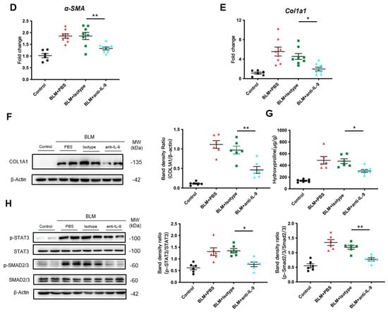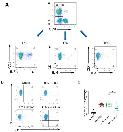 The following are available online at https://www.mdpi.com/article/10.3390/cells10113209/s1, Figure S1: Neutralizing IL-9 attenuates pulmonary fibrosis and collagen content in the bleomycin (BLM)-induced pulmonary fibrosis mice (therapeutic intervention). (A) Schematic showing therapeutic intervention in the BLM model. Drugs (PBS/Isotype/anti-IL-9, every 3 days) were injected intraperitoneally starting at day 7, and lungs were assessed on day 21 after BLM administration. (B) Representative HE staining and quantitative analysis of lung sections from mice of different experimental groups (n = 6 to 8). Inflammatory cell infiltration was indicated by black arrows. Scale bars, 50 μm. (C) Representative Masson’s trichrome staining and quantitative analysis of lung sections from mice of different experimental groups (n = 6 to 8). Deposited collagen was indicated by black arrows. Scale bars, 50 μm. (D) Col1a1 in mice of different experimental groups (n = 6 to 8). (E) Representative western blot images and quantitative analysis of COL1A1 in lung homogenates from mice of different experimental groups (n = 6). β-Actin was used as a loading control. (F) Lung hydroxyproline content in mice of different experimental groups (n = 6 to 7). (G) Representative images and quantitative analysis of western blots of STAT3 and SMAD2/3 phosphorylation and their total expression in lung homogenates from mice of different experimental groups. (B–G) p values were determined by one-way ANOVA. Data were expressed as mean ± SEM. *, p < 0.05; **, p < 0.01, ***, p < 0.001. Figure S2: Effects of IL-9 neutralizing antibody on the ratio of Th9 cells, Th2 cells, and Th1/Th2 in lung lymphocytes of bleomycin (BLM)-induced pulmonary fibrosis mice (therapeutic intervention). (A,C,E) Representative pseudo-color plot showing proportion of Th9, Th1, Th2 to CD4+T cells in the mice lung detected by flow cytometry. (B,D,F) Proportions of Th9, Th1, Th2 cells to CD4+T cells in the lungs of mice from different experimental groups. (G) Th1/Th2 ratio in the lungs of mice from different experimental groups. p values were determined by one-way ANOVA (Tukey’s test). Data were expressed as mean ± SEM. *, p < 0.05, **, p < 0.01, ***, p < 0.001.