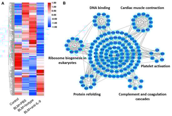 We also conducted a comparative proteomics study in an attempt to identify genes and important signal pathways involved in this intervention. A heatmap represents abundance profile of all differentially expressed proteins in the four groups (Figure 7A). To better understand the function of these differentially expressed proteins, they were subjected to a protein–protein interaction (PPI) network analysis using the STRING database. The PPI network was analyzed for highly connected nodes by MCODE. Six highly connected clusters have been identified including complement and coagulation cascades, protein refolding, ribosome biogenesis in eukaryotes, DNA binding, cardiac muscle contraction, and platelet activation (Figure 7B). We also performed GO-based enrichment and KEGG pathway enrichment analysis of proteins (Figure 7C). Negative regulation of JAK-STAT cascade, regulation of MAPK cascade, cytokine-mediated signaling pathway, PPAR signaling pathway, etc. were enriched. To draw an unbiased picture of the proteomic changes occurring in different groups, we next clustered the 438 differential proteins on the basis of their expression in different interventions into nine distinct profiles (Figure 7D). Cluster 1 (e.g., C9, Fgf1, Yap1, Gp5) and 8 (e.g., C8g, Tgtp1, Tie1, Lamp3) represent those proteins that decline post BLM instillation and increase in the intervention group, whereas cluster 2 (e.g., Vmac, Ppp1r14b, Irgq) and 9 (e.g., Tgfbi, Col15a1, Nfkbie, Timp1) consist of proteins that rise post BLM instillation and decline in the intervention group. These four clusters are of our interest as they include the proteins that have the opposite effect of BLM.
