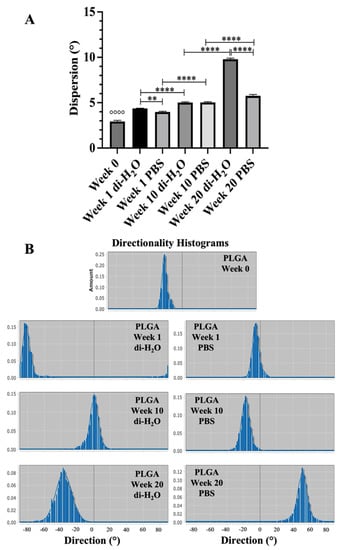 (A) The histogram shows the changes in fiber alignment of week 0 and electrospun PLGA scaffolds throughout 20 weeks of degradation under both di-H2O and PBS conditions. °°°° statistically significant between the different studied groups compared to PLGA week 0 (p < 0.0001). ** and **** statistically significant between the degraded PLGA scaffolds (p < 0.01 and p < 0.0001, respectively). (B) Representative histograms of each sample showing the angle distribution on the electrospun PLGA scaffolds throughout the degradation studies.