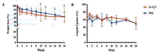 (A) Weight loss and (B) liquid uptake of electrospun PLGA scaffolds degraded in PBS and di-H2O solutions at 37 °C up to 20 weeks. * and § statistically significant vs. week 0 (p < 0.05). Statistical symbols in blue and red refer to di-H2O and PBS, respectively.