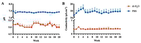 The variation of pH and conductivity values of PBS and di-H2O solutions during the degradation of the electrospun PLGA scaffolds are shown in Figure 4. In particular, the pH values of PBS decreased slightly after 1 week from 7.49 ± 0.03 to 7.35 ± 0.02 (p < 0.05) before returning nearly to its initial value of 7.43 ± 0.04 and remaining intact and unchanged throughout the whole degradation period (p > 0.05; Figure 4A). Under di-H2O conditions, pH decreased from 5.20 ± 0.03 at week 0 to reach 5.00 ± 0.05 (p < 0.05) until the end of the experiment (Figure 4A).