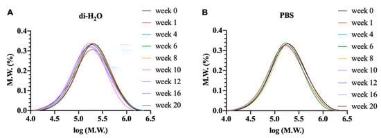 The molecular weight distribution (MWD) of ha-PLGA scaffolds subjected to di-H2O and PBS media was also evaluated via GPC measurement (Figure 5). A unimodal distribution was observed for the non-exposed PLGA scaffold (week 0) that showed a sharp peak at 5.2 g.mol−1. When the electrospun scaffolds were immersed in di-H2O (Figure 5A), MWD exhibited a linear decrease from 143,631 g.mol−1 at week 0 to 94,570 ± 6345 g.mol−1 at 20 weeks (p < 0.0001). Under PBS conditions (Figure 5B), PLGA scaffolds experienced a slight exponential decrease reaching a value of 102,874 g.mol−1 at the end of week 20 (p < 0.0001). The MWD showed a slight shift to the left under both degradation conditions with a relatively more relevant profile under H2O conditions. The obtained MWD profile hypothesizes the hydrolytic degradation of the ester bonds with the subsequent chain scission within the PLGA scaffolds.