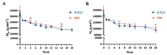 Moreover, the number average molecular weight (Mn) exhibited two sharp decreases along the degradation period, followed by a gradual one (Figure 6B). The first one was similar to Mw, where Mn decreased sharply to about 11.62% (di-H2O) and 10.32% (PBS) after 1 week of degradation (p < 0.0001). The second decrease was between weeks 2 and 6, where Mn showed values of about 23.82% and 18.54% under di-H2O and PBS (p < 0.001). Subsequently, Mn continued to diminish gradually until attainment of 34.15% and 28.37% of loss under di-H2O and PBS, respectively, by the end of week 20 (p < 0.0001 vs. week 0; Figure 6B).