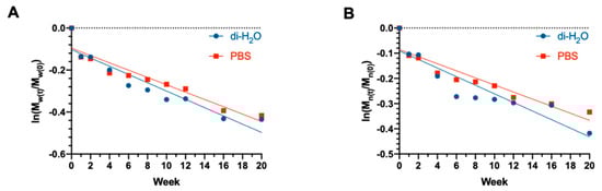 where K is the apparent degradation rate, Mt and M0 are the number or weight average molecular weight at each degradation time point, respectively, and t = 0, and t is the time represented by week−1. The degradation half-time can be further calculated using the following Equation (5):