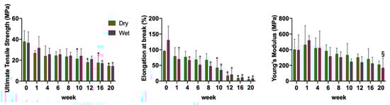 Mechanical properties were assessed in terms of ultimate tensile strength (UTS), elongation at break, and Young’s modulus of degrading ha-PLGA scaffolds at each degradation time point under both wet and dry conditions as described previously. The obtained results are illustrated in Figure 8.
