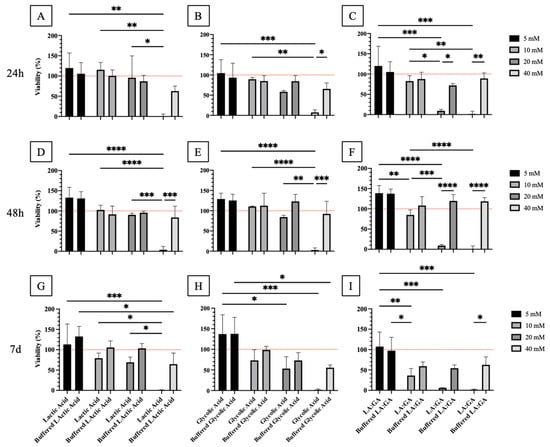 MTT oAECs analysis on the effect of PLGA degradation by-products (A,D,G). Lactic acid (LA) and buffered LA (B,E,H), glycolic acid (GA) and buffered GA, and (C,F,I) LA:GA and buffered LA:GA at different concentrations (5, 10, 20, and 40 mM) at 24 h, 48 h, and 7 d. CTR viability value (100%) has been used as reference (dotted red line). *, **, ***, and **** statistically significant between tested groups (p < 0.05, p < 0.01, p < 0.001, and p < 0.0001, respectively).